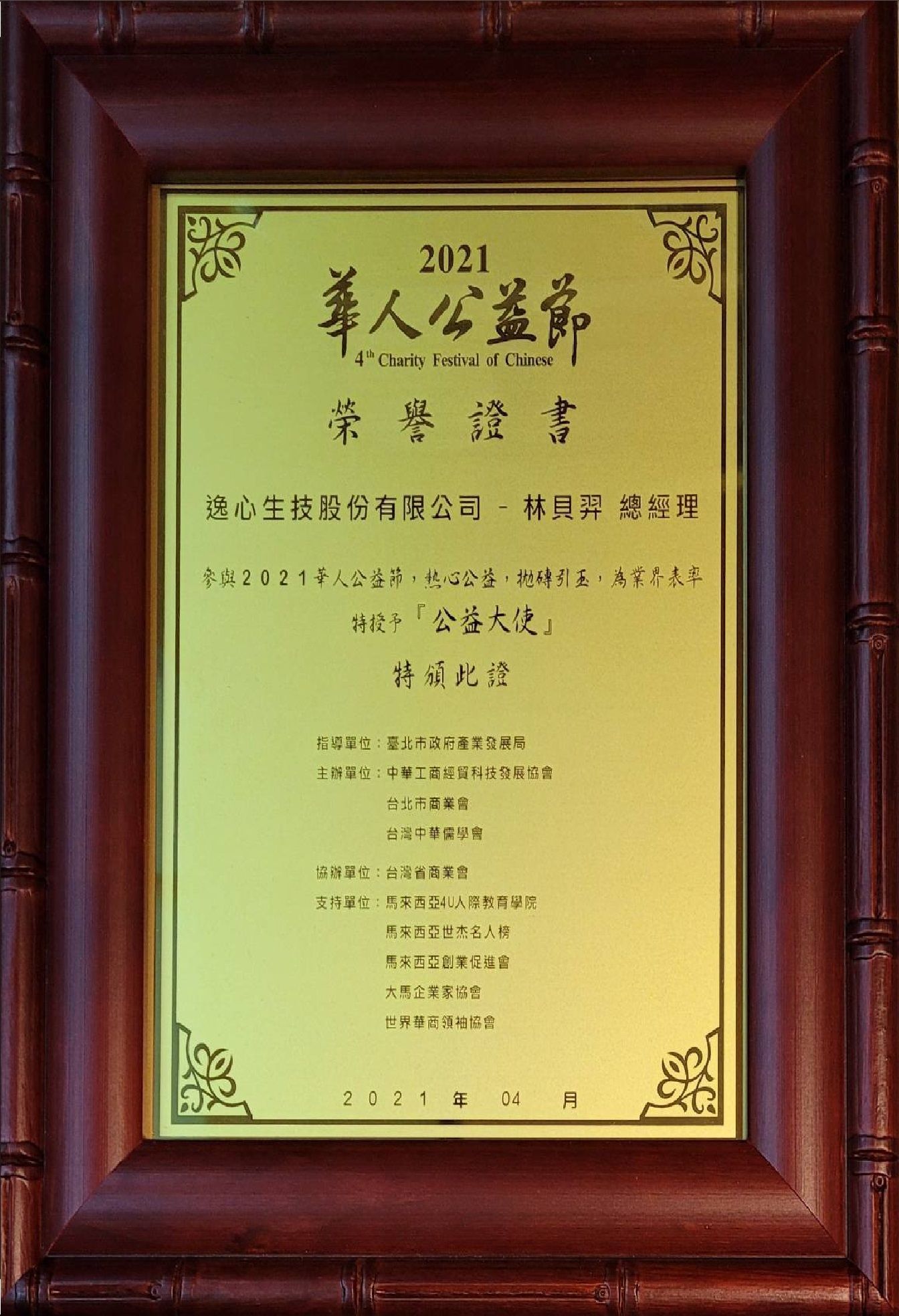 熱心公益,拋磚引玉,榮獲2021華人公益節「公益大使」。